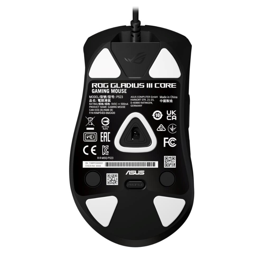 ROG Gladius III Core je 72gramová káblová herná myš s ergonomickým tvarom, vybavená optickým senzorom s rozlíšením 12 000 dpi, spínačom ROG Micro Switch II, zásuvkami ROG Push-Fit Switch Sockets, káblom ROG Paracord a 100% PTFE podložkami.