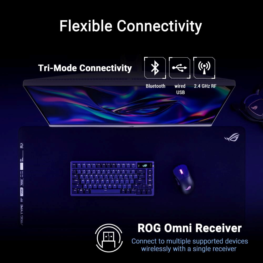 - Ultrarýchly bezdrôtový výkon: Všestranné možnosti pripojenia: 2,4GHz bezdrôtové RF, Bluetooth® a káblové USB; pribalený prijímač ROG Omni podporuje bezdrôtové pripojenie viacerých zariadení pomocou jediného prijímača