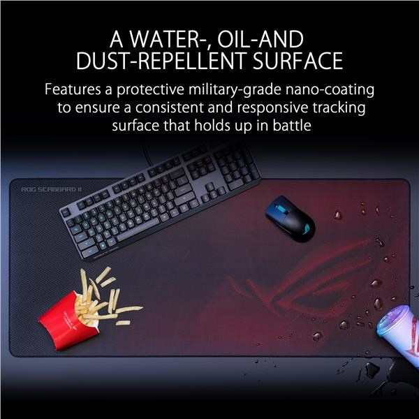 Predĺžená herná podložka pod myš ROG Scabbard II s ochrannou nano vrstvou pre povrch odpudzujúci vodu, olej a prach, s plochými šitými okrajmi proti šmuhám a protišmykovou gumovou základňou
