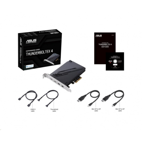 | Príslušenstvo | 2 x káble mini DisplayPort (spájajú grafický výstup DisplayPort základnej dosky alebo diskrétnej grafickej karty s portom mini DisplayPort IN na karte ThunderboltEX 4) 1 x USB 2.0 kábel 1 x 14-1-pinový kábel Thunderbolt 1 x používateľská príručka 1 x podporné DVD s ovládačom Thunderbolt™ |