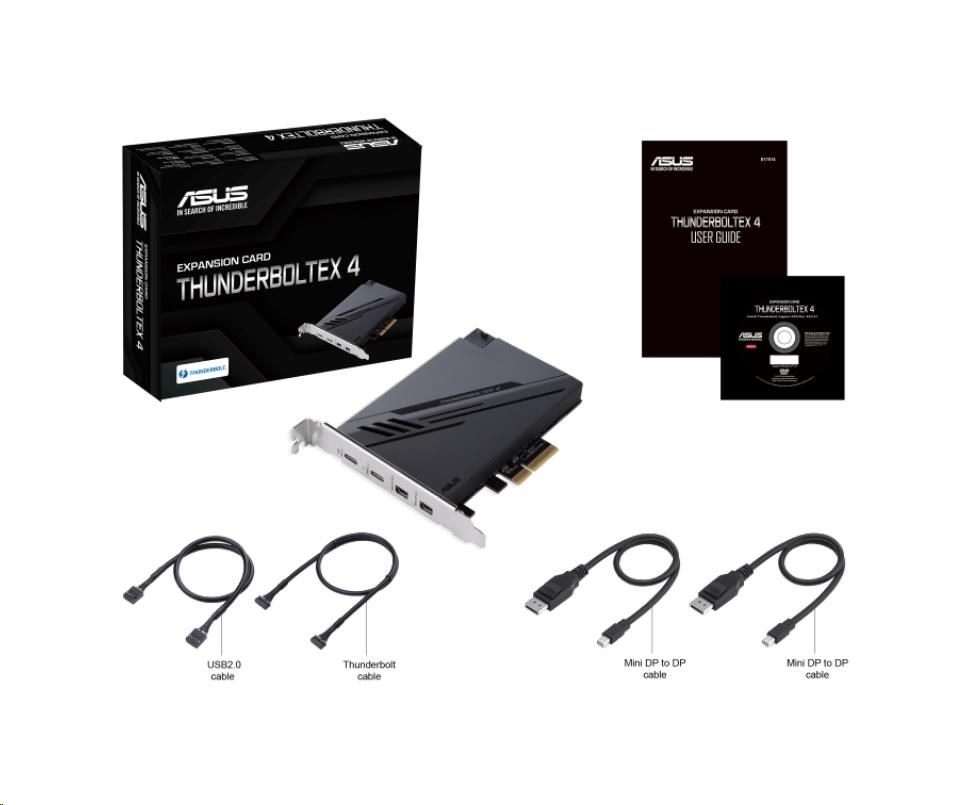 | Príslušenstvo | 2 x káble mini DisplayPort (spájajú grafický výstup DisplayPort základnej dosky alebo diskrétnej grafickej karty s portom mini DisplayPort IN na karte ThunderboltEX 4) 1 x USB 2.0 kábel 1 x 14-1-pinový kábel Thunderbolt 1 x používateľská príručka 1 x podporné DVD s ovládačom Thunderbolt™ |