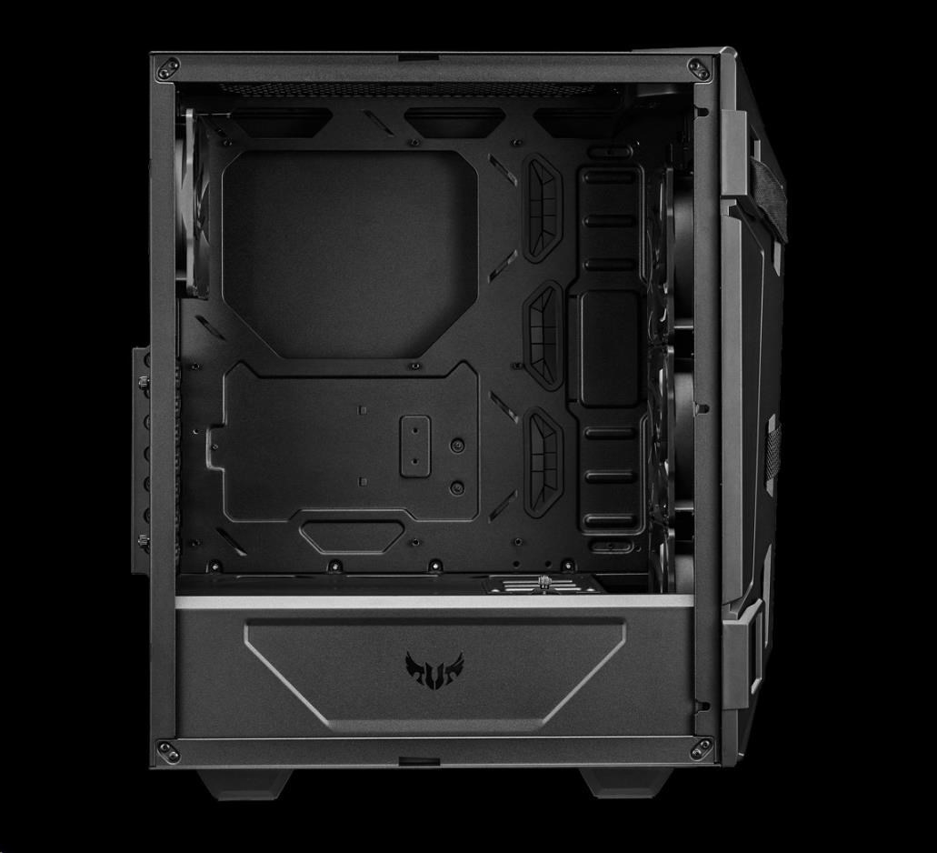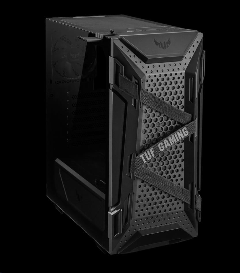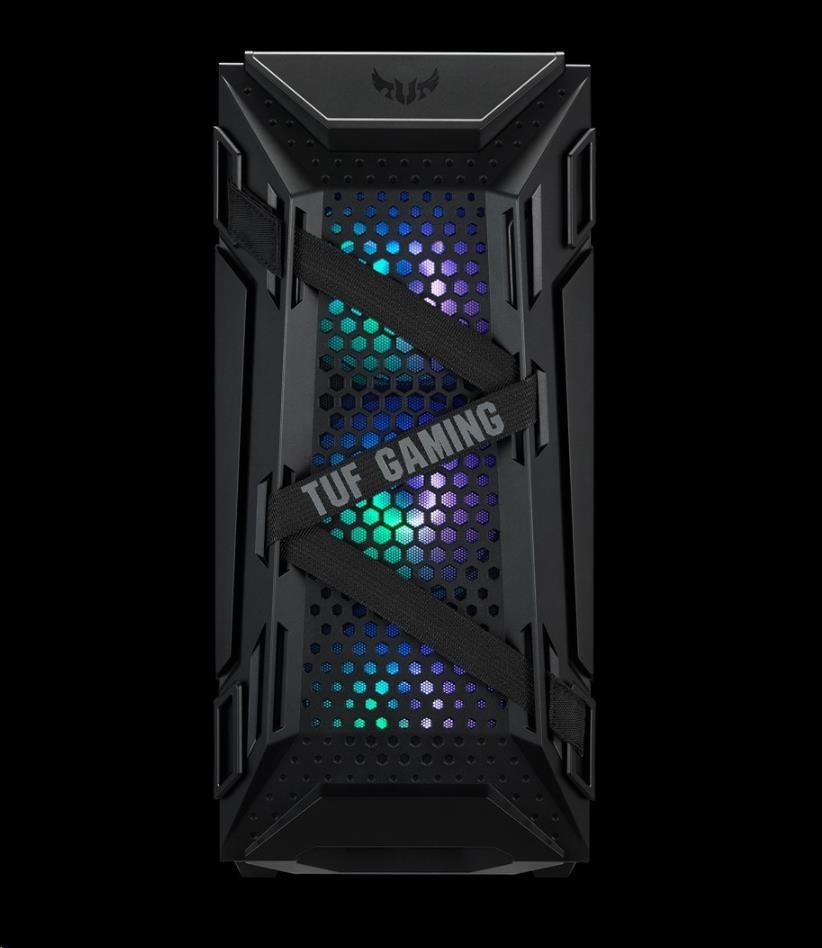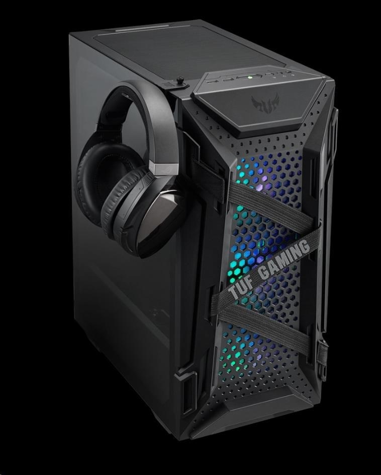 Kompaktná skrinka ASUS TUF Gaming GT301 ATX typu mid-tower s bočným panelom z tvrdeného skla, predným panelom voštinového typu, 120 mm ventilátorom AURA Addressable RGB, závesom na slúchadlá a 360 mm radiátorom.