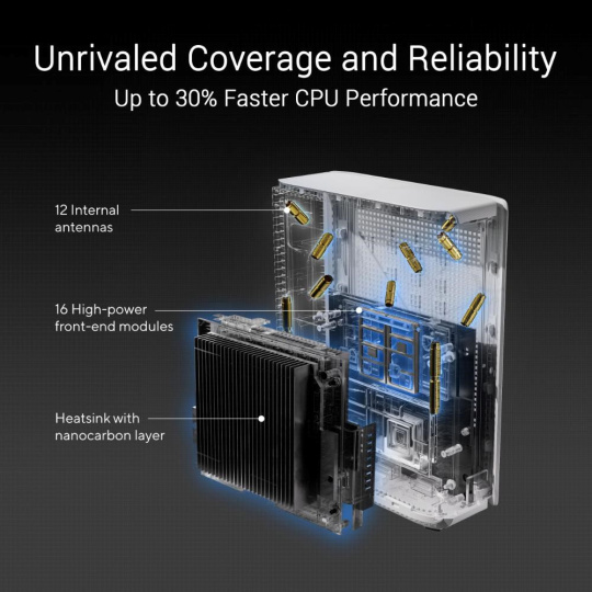 - Dvanásť interných antén a šestnásť vysoko výkonných predných modulov eliminujú mŕtve zóny WiFi vo všetkých smeroch, zatiaľ čo robustný rozptyl tepla zvyšuje spoľahlivosť WiFi.