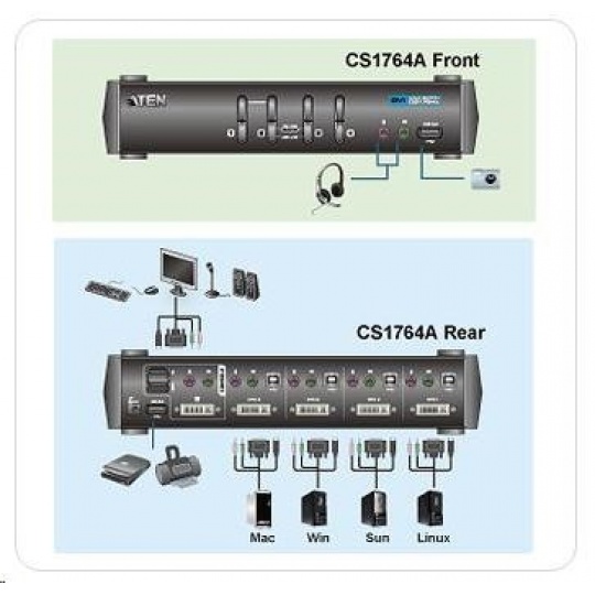 CS1764A ATEN 4-portový DVI KVMP USB, 2-portový USB HUB, audio, 1.2m káble 4PC - 1 DVI + 1 USB kľúč. + 1 myš USB + 2 periférne zariadenia USB Umožňuje ovládať až 4 počítače a dve ďalšie zariadenia USB 2.0 periférie. - extrémna kvalita videa až do 1920 x 1200, 60 Hz; DDC2B - umožňuje spravovať 4 počítače na jednom kl.,m., monitora a dvoch ďalších USB 2.0 zariadení - možnosť pripojenia PC cez USB - možnosť nezávislého prepínania PC a USB a audio zariadení - vrátane káblov pre pripojenie PC prepínača - podpora viacerých platforiem - Windows, Linux, Mac a Sun - výber PC pomocou klávesových skratiek alebo tlačidla na prednom paneli - vrátane káblov, ktoré sú súčasťou sady - umožňuje aj prepínanie zvuku (až 2.1 audio) - Podpora digitálneho a analógového monitora DVI - Kompatibilita s HDCP - Video DynaSync™ - uchováva informácie o monitore EDID (Extended Display Identification Data) - Detekcia zapnutia - prepne na ďalší aktívny port, ak je počítač vypnutý - Podpora a emulácia klávesnice Sun/Mac - Režim automatického skenovania Súčasťou balenia je: 1x CS1764A USB 2.0 Prepínač DVI KVMP™ 4x Súprava káblov na pripojenie 4 počítačov (DVI-D) 1x Napájací adaptér 1x Príručka 1x Stručný návod Podpora systému Windows 7...