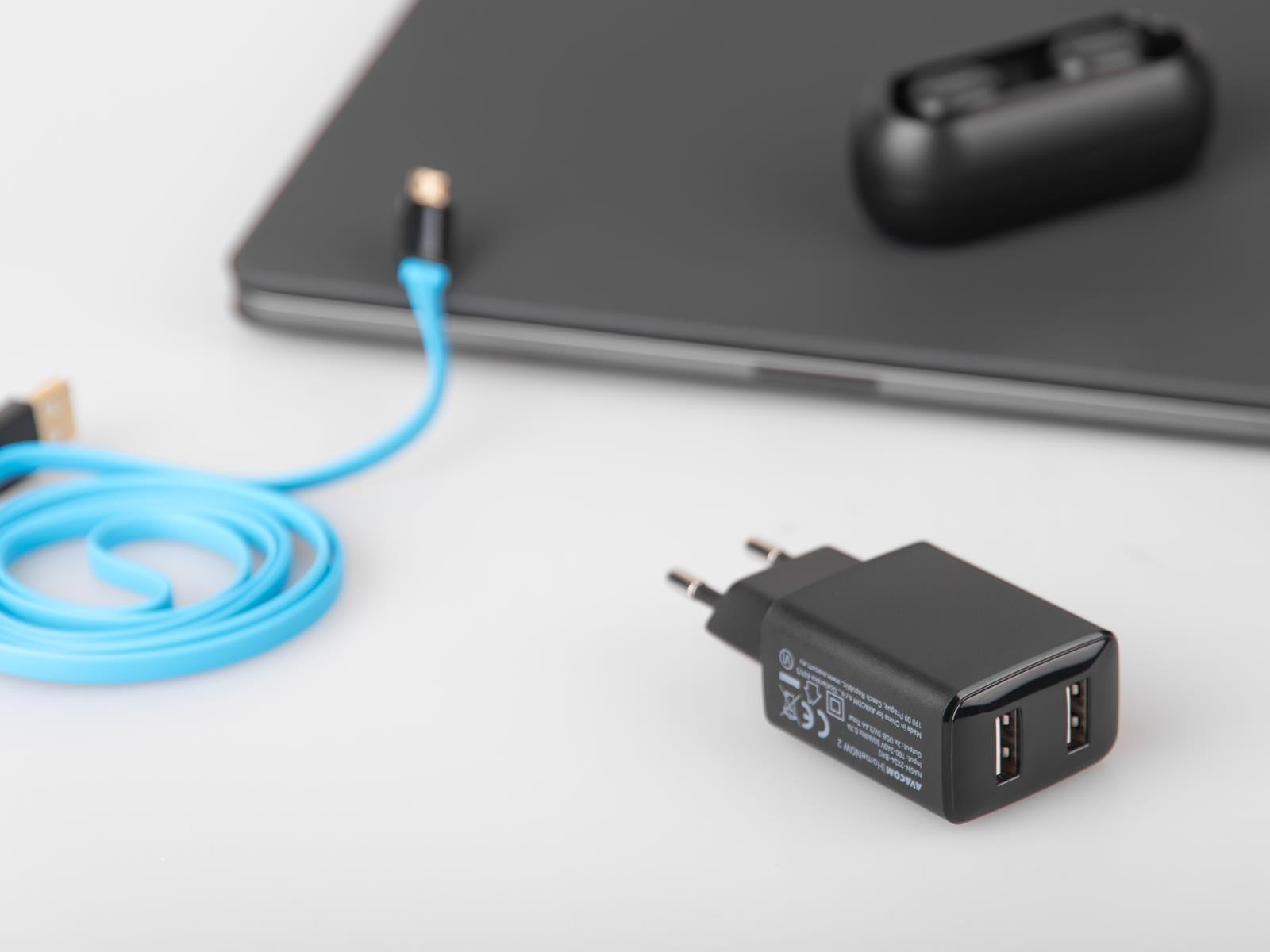 Univerzálna sieťová nabíjačka, 2x USB výstup na nabíjanie smartphonov, tabletov a ďalších zariadení.
