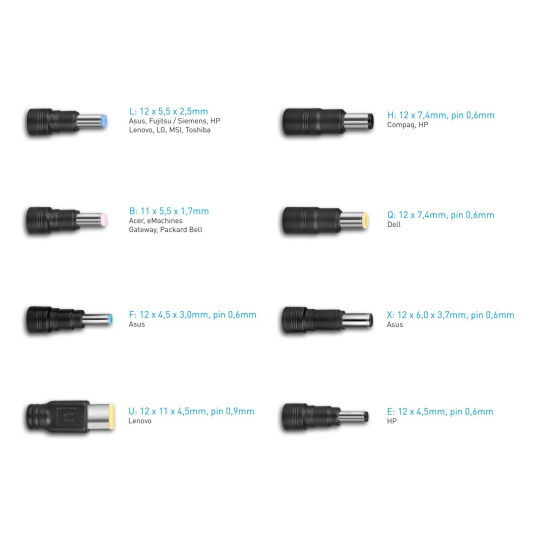 Univerzálny nabíjací adaptér pre notebooky AVACOM QuickTIP 150W dokáže so svojimi 8 rôznymi konektormi napájať väčšinu notebookov a herných notebookov obľúbených značiek Acer, Asus, Compaq, Dell, Fujitsu/Siemens, Gateway, HP, LG, Lenovo, MSI, Packard Bell, Toshiba, eMachines aj iných zariadení, vyžadujúcich napájanie zo siete.