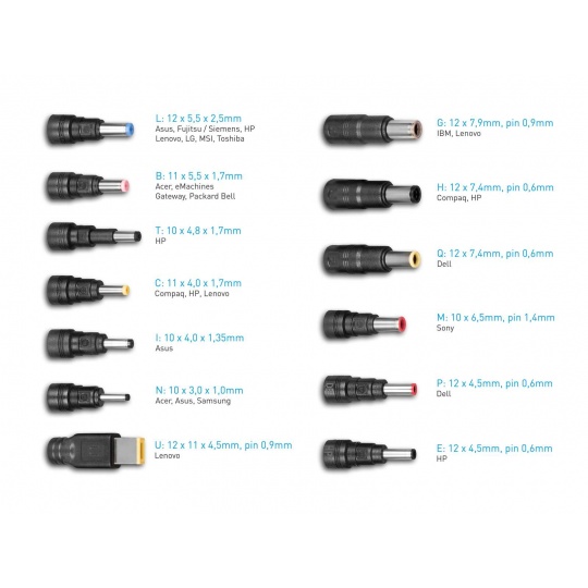 Univerzálny nabíjací adaptér AVACOM QuickTIP 90 W pre notebooky s 13 rôznymi konektormi dokáže napájať prevažnú väčšinu notebookov obľúbených značiek, ako sú Acer, Asus, Compaq, Dell, Fujitsu/Siemens, Gateway, HP, IBM, LG, Lenovo, MSI, Packard Bell, Samsung, Sony, Toshiba, eMachines a ďalšie zariadenia vyžadujúce sieťové napájanie.