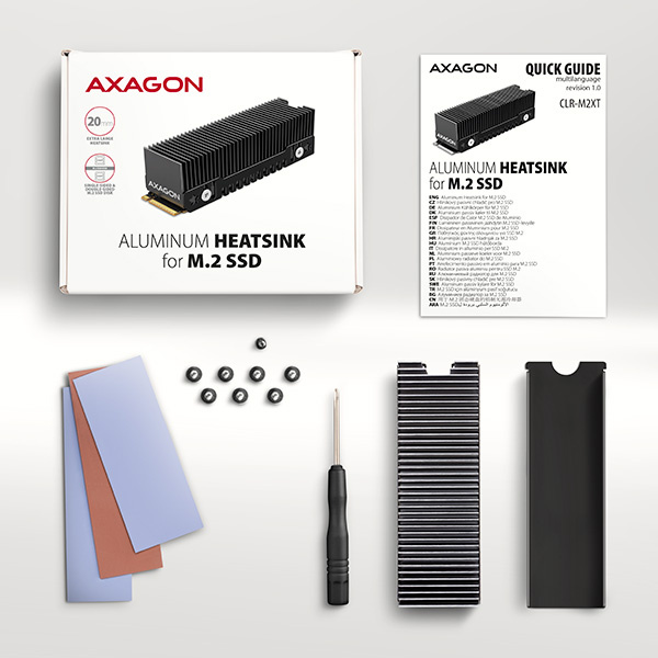 AXAGON CLR-M2XT ALU je pasívny hliníkový chladič určený na intenzívne chladenie výkonných NVMe M.2 SSD. Univerzálny chladič je možné použiť pre karty M.2 s rozmermi 22 x 80 mm. Dodávané tepelné podložky umožňujú inštaláciu chladiča pre všetky jednostranné a obojstranné M.2 SSD.