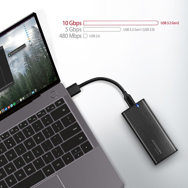 Hliníkový externý box AXAGON EEM2-SBC RAW s USB 3.2 Gen 2 rozhranie určené pre SATA M.2 disky SSD. Obojstranný konektor USB-C na krabici spolu s priloženým káblom USB-C -> USB-A umožňuje spoľahlivé pripojenie k počítaču.