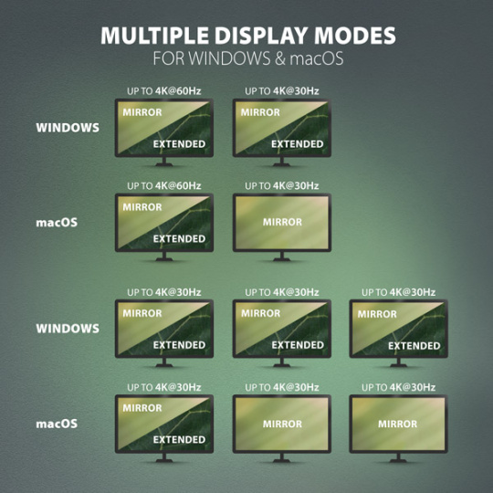 Každý z troch video výstupov (2x HDMI + 1x DisplayPort) poskytuje vysokokvalitný obraz až do 4K/60Hz Ultra HD. Vysoké frekvencie sú podporované aj v populárnych herných rozlíšeniach 2K/144Hz alebo FullHD/240Hz. Aj pri pripojení troch monitorov súčasne dokáže dokovacia stanica poskytnúť rozlíšenie až 4K/30Hz na každom z nich. Vďaka podpore HDR (High Dynamic Range) si môžete vychutnať výrazne rozšírenú škálu farieb a kontrastov bez obmedzení. Aby video výstup fungoval správne, port USB-C prenosného počítača musí podporovať alternatívny režim DisplayPort (DP Alt Mode) alebo Thunderbolt 3/4. Podpora vyššie uvedených maximálnych podporovaných rozlíšení a frekvencií vyžaduje pripojenie k počítaču s DisplayPort verzie 1.4.