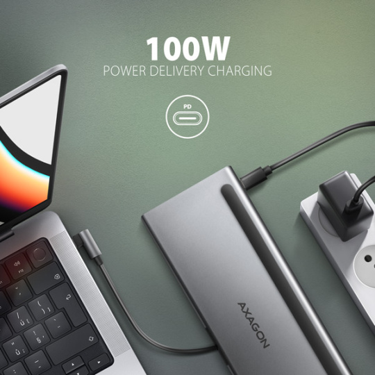 Konektor USB-C je vyhradený len pre napájanie a súčasné nabíjanie notebookov pomocou technológie Power Delivery 3.0 s výkonom až 100W. Zapojíte nabíjačku USB-C Power Delivery do rozbočovača a pripojíte ho k notebooku. Tým sa uvoľní aj jeden port USB-C. Podstatou je notebook s podporou nabíjania z USB-C portu pomocou Power Delivery a vhodnej PD nabíjačky.