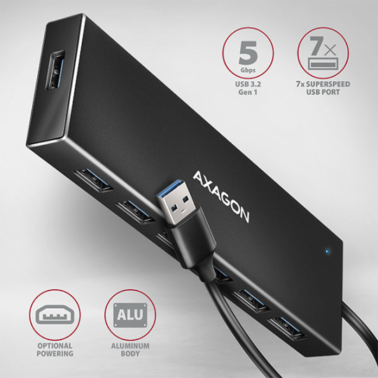 AXAGON HUE-F7A, 7x USB 3.2 Gen 1 ALU FLAT CHARGING hub, micro USB napájací konektor, kábel USB-A 1m