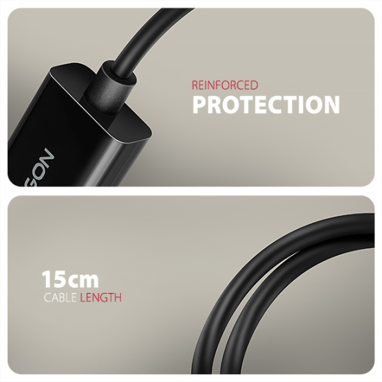 Zníženie je vyrobené z kvalitných materiálov, ktoré zabezpečujú vysokú spoľahlivosť. Kábel aj konektory sú chránené proti ohýbaniu, čím sa predlžuje ich životnosť. Adaptér navyše disponuje 15 cm flexibilným káblom pre jednoduchšiu manipuláciu.