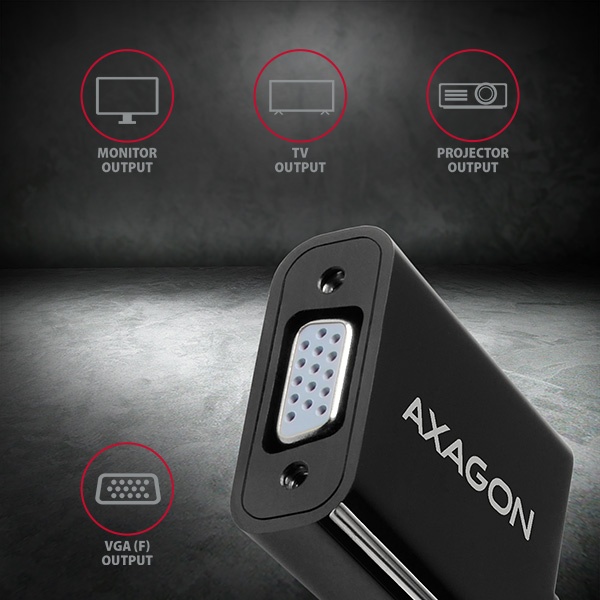 DisplayPort -> VGA aktívny adaptér AXAGON RVD-VGN pre pripojenie staršieho VGA monitora/TV/dataprojektoru k počítaču alebo inému zariadeniu s výstupom Display Port.