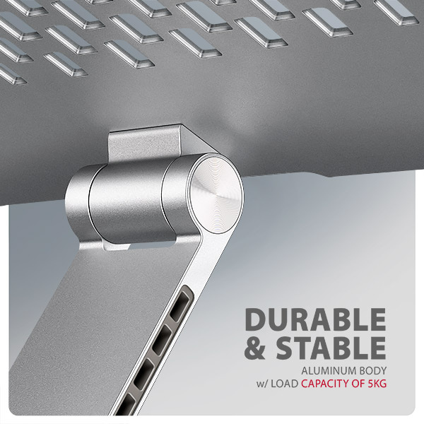 Stojan na notebook je vyrobený z robustných hliníkových odliatkov zaručujúcich dlhú životnosť a spoľahlivosť. Vďaka protišmykovej úprave zostane vaše zariadenie bezpečne na svojom mieste bez rizika nežiaducich pohybov, bez akéhokoľvek poškodenia povrchu notebooku alebo podložky. Tieto starostlivo navrhnuté funkcie zaručia dokonalú stabilitu vášho notebooku, tabletu alebo obľúbenej knihy, čo vám poskytne pokoj a pohodlie pri každodennom používaní.