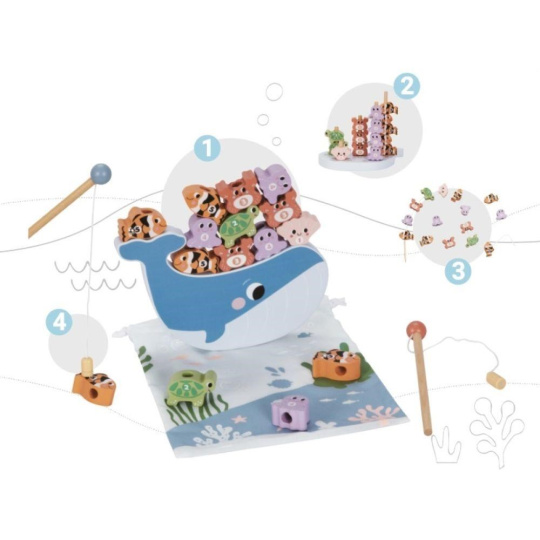 Súbor hier Rybky 4v1 sa skladá zo 4 obľúbených detských hier, ako sú balančná hra, drevená nasadzovacia hra, navliekanie a rybolov, so spoločnou tématikou - oceánom, morskými živočíchmi. Všetky tieto hry sú vyrobené z prírodného dreva a sú zárukou veľkej zábavy, ktorá prirodzeným spôsobom rozvíja detské zručnosti. Morským motívom aj farbami je sada hier 4v1 vhodná pre dievčatká aj chlapcov.