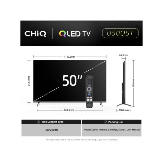 CHiQ 50“ U50QST, ultra tenká kovová bezrámečková QLED Smart Google TV 5.0 s niekoľkými hernými funkciami, HDR10, HLG, obraz s Ultra HD rozlíšením 3840 x 2160 pixelov, priestorový zvuk Dolby Audio a dbx-tv.