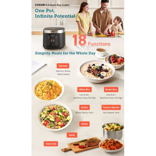 Multifunkčný rýžovar Cosori ponúka rôzne možnosti prípravy jedál: rôzne druhy a úrovne prípravy ryže (podľa chuti - štandardná, mäkká alebo tvrdšia), kaše a iné obilniny, ale aj ďalšie funkcie ako režim pomalého varenia, varenie v pare, dusenie, režim udržiavania teploty, odložené varenie, pečenie alebo režim rýchlej prípravy ryže.