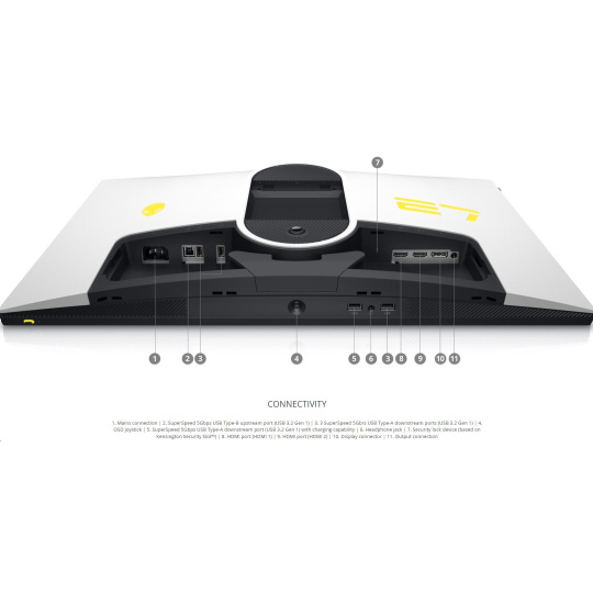 | 1. Pripojenie k sieti 2. SuperSpeed 5Gbps USB Type-B upstream port (USB 3.2 Gen 1) 3. 3 SuperSpeed 5Gb/s USB Type-A downstream ports (USB 3.2 Gen 1) 4. OSD joystick 5. SuperSpeed 5Gbps USB Type-A downstream port (USB 3.2 Gen 1) s nabíjaním 6. Výstup na slúchadlá 7. Bezpečnostné zabezpečenie (na základe Kensington Security Slot™) 8. HDMI port (HDMI 1) 9. HDMI port (HDMI 2) 10. Display pripojenie 11. Výstupné pripojenie |