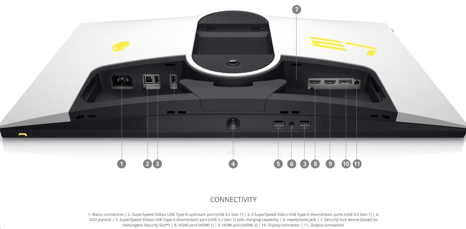 | 1. Pripojenie k sieti 2. SuperSpeed 5Gbps USB Type-B upstream port (USB 3.2 Gen 1) 3. 3 SuperSpeed 5Gb/s USB Type-A downstream ports (USB 3.2 Gen 1) 4. OSD joystick 5. SuperSpeed 5Gbps USB Type-A downstream port (USB 3.2 Gen 1) s nabíjaním 6. Výstup na slúchadlá 7. Bezpečnostné zabezpečenie (na základe Kensington Security Slot™) 8. HDMI port (HDMI 1) 9. HDMI port (HDMI 2) 10. Display pripojenie 11. Výstupné pripojenie |