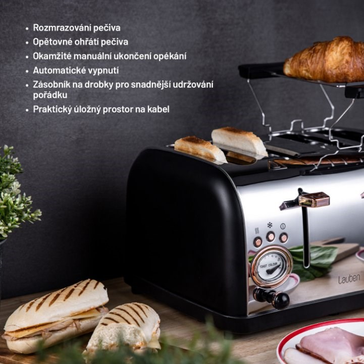 Pro dokonalou rodinou snídaniZpříjemněte si začátek dne výtečnou rodinou snídaní. Už žádné hádky o první křupavý toast. Díky Lauben 4 Slice Toaster 1500BC připravíte snídani až pro čtyři osoby najednou, přesně tolik chlebů do topinkovače naráz vložíte a na dvou přiložených ohřívacích mřížkách rozpečete další pečivo. Zvolit můžete z 6 stupňů intenzity opékání, dále je k dispozici funkce pro rozmrazování pečiva či funkce opětovného ohřátí pro případ, že pečivo vychladne. Pokud se vám zdá, že se toast připéká, stačí využít funkce okamžitého manuálního ukončení opékání. Přístroj se snadno udržuje, stačí vyjmout tác na drobky a vysypat. Prémiový design z nerezové oceli nenaruší ani kabel, který snadno ukryjete do dna základny. Toaster navíc vytváří dokonale stylový snídaňový set spolu s rychlovarnou konvicí Lauben Kettle 17BC.
