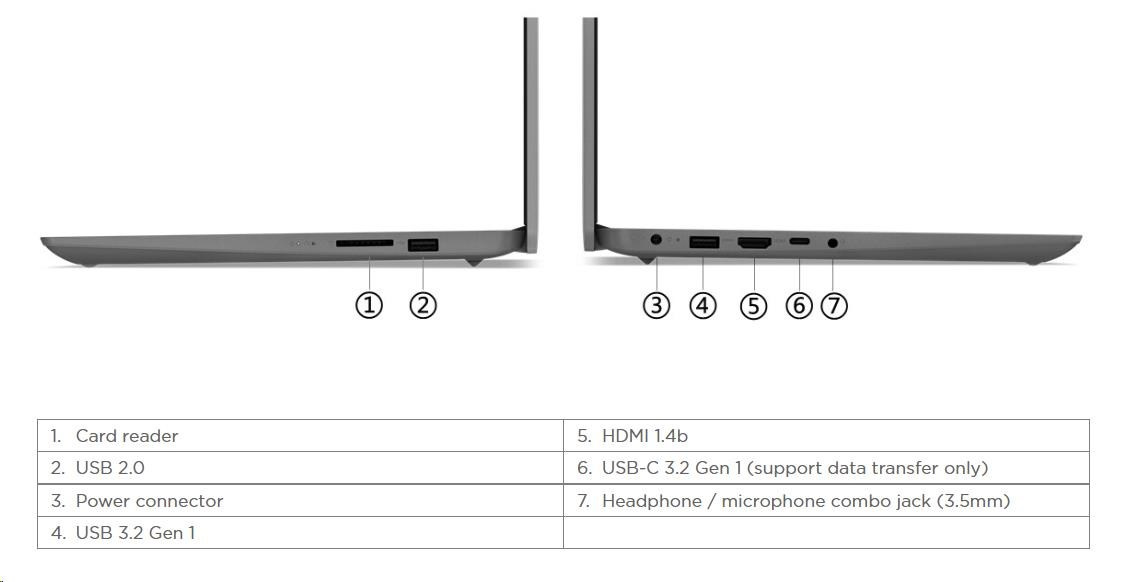 Standartné porty | 1x USB 2.0 1x USB 3.2 Gen 1 1x USB-C® 3.2 Gen 1 (support data transfer only) 1x HDMI® 1.4b 1x Headphone / microphone combo jack (3.5mm) 1x Card reader 1x Power connector |