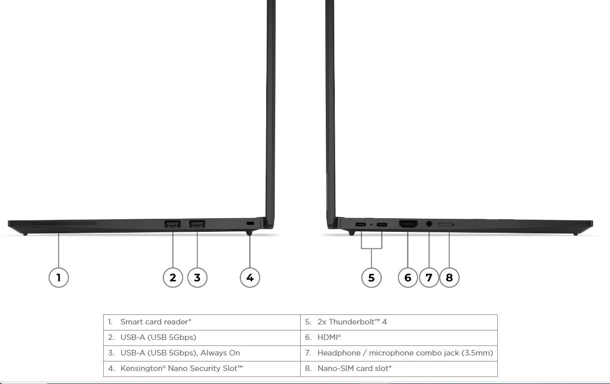 Standartné porty | 1x USB-A (USB 5Gbps / USB 3.2 Gen 1) 1x USB-A (USB 5Gbps / USB 3.2 Gen 1), Always On 2x USB-C® (Thunderbolt™ 4 / USB4® 40Gbps), with USB PD 3.0 and DisplayPort™ 2.1 1x HDMI® 2.1, up to 4K/60Hz 1x Headphone / microphone combo jack (3.5mm) |