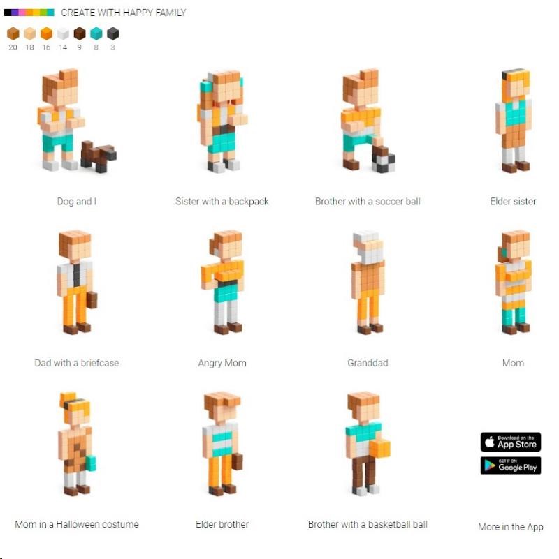 PIXIO Happy Family obsahuje 88 PIXIO blokov v 7 farbách. Oživte svoje kreatívne nápady a