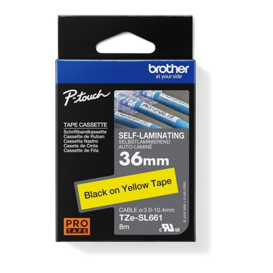 Samolepiaca páska TZe-SL661 s dĺžkou 36 mm s čiernym tlačom na žltej bola vyvinutá pre dlhodobú identifikáciu sieťových káblov. Má špeciálne lepiace vlastnosti štítkov pre trvácne pevné obmotanie okolo vašich vodičov a káblov. Kompatibilná s niektorými modelmi P-touch, ktoré používajú pásky TZe 36 mm.