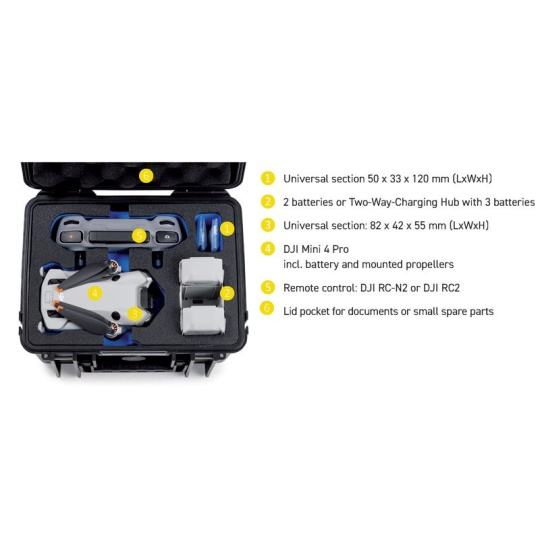 The outdoor.case 2000 with foam insert for DJI Mini 4 Pro offers, despite its compact size, space for a DJI Mini 4 Pro (DJI RC-N2 or DJI RC2) or the extensive DJI Mini 4 Pro Fly More Combo and additional equipment. Thanks to the customised foam insert it is possible, to safely transport up to 4 battery packs (one of which in the copter) in the case.