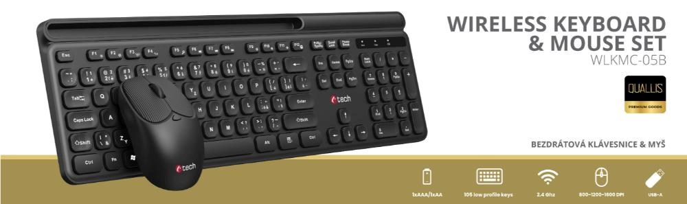 C-TECH klávesnice s myší WLKMC-05B, Bezdrátový set 2.4GHz, CZ, Černá