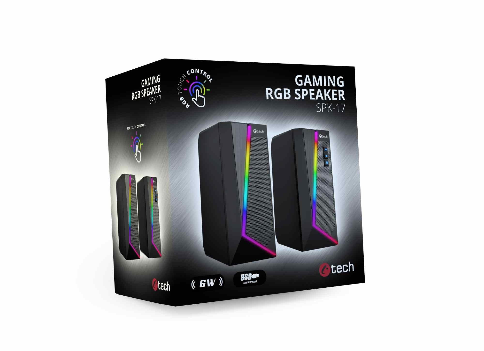 Stolové reproduktory C-tech SPK-17 s elegantným dizajnom a decentným RGB osvetlením sa stanú štýlovým doplnkom každého pracovného stola. Vďaka 40mm meničom s širokým frekvenčným rozsahom doprajú vašim uším veľmi kvalitnú reprodukciu. RGB osvetlenie disponuje 6 rôznymi svetelnými režimami, ktoré vám zaručia originálne vizuálne zážitky. Voľba režimu je veľmi jednoduchá a to dotykom na hornú plochu riadiaceho reproduktora. Reproduktory pripojíte k počítaču pomocou 3,5mm audio kábla a nemusíte si robiť starosti ani s prídavným napájaním, pretože reproduktory C-tech SPK-17 sú napájané priamo z USB vášho počítača a tak sa vám automaticky spustia či vypnú spolu s počítačom či notebookom. K ovládaniu hlasitosti poslúžia tlačidlá nachádzajúce sa na jednom z reproduktorov. Spoločne s ovládaním hlasitosti je možné stlačením ďalšieho tlačidla vypnúť RGB podsvietenie reproduktora.