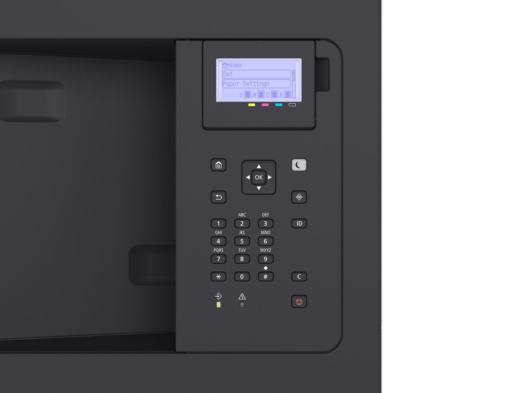 Ovládací panel LCD displej s 5 riadkami, 5 LED indikátorov (Online, Ready, Message, Job a Energy saver), tlačidlá, numerická klávesnica s 10 klávesmi
