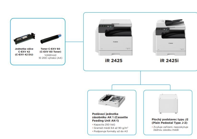 | Prídavný podávač papiera AK1 | Kapacita papiera: 1×250 listov (80 g/m2) Typ papiera: bežný, recyklované, farebné, perforované Veľkosť papiera: A3, A4, A4R, A5, B4, B5, B5R Hmotnosť papiera: 64 až 90 g/m2 Zdroj napájania: z hlavnej jednotky Rozmery (š × h × v): 581 × 575 × 92 mm Hmotnosť: cca,8 kg |