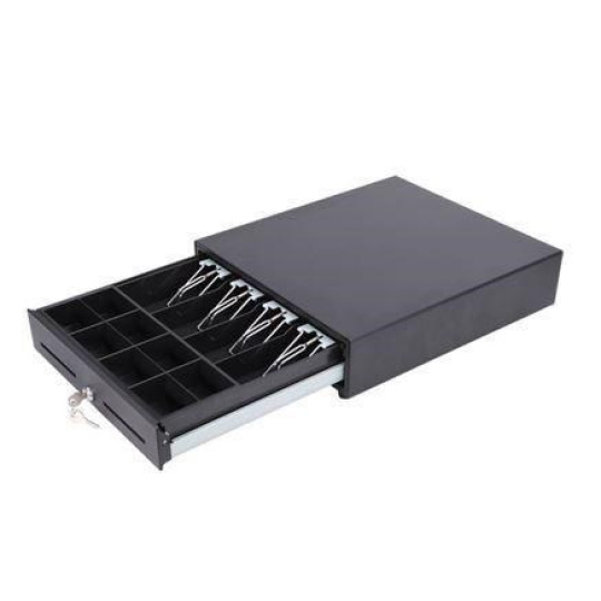 - Kovová pokladničná zásuvka s guľôčkovým ložiskom pre veľké zaťaženie - Ochranná konštrukcia - Vrátane priehradky na bankovky: nastaviteľné priečky až pre 4 priehradky (s 4 kovovými sponami) - Vrátane priehradky na mince: dvojradová s nastaviteľnými priečkami pre 8 priehradiek - Otvor na médiá s predným prístupom pre šek, potvrdenie o kreditnej karte alebo akýkoľvek papier - 3-polohový zámok na kľúč - 6V, 12V, 24V pre rozhranie tlačiarne účteniek RJ11 / RJ12