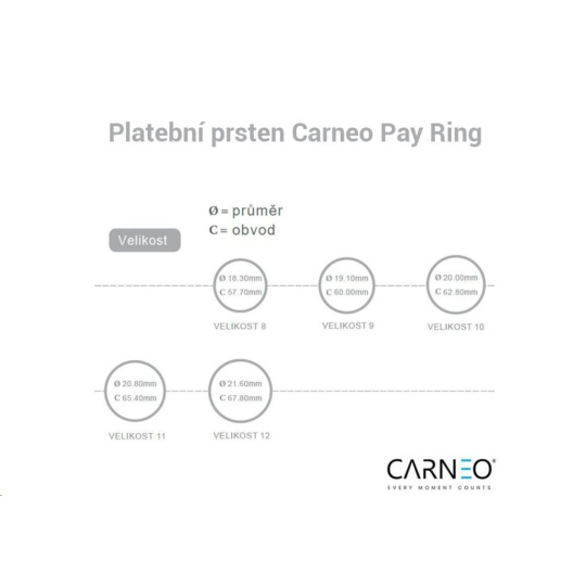 Elegantný platobný prsteň Carneo, vyrobený z prémiovej odolnej keramiky, kombinuje vysokú odolnosť voči poškrabaniu, vodeodolnosť a pohodlie nosenia. Platby sú realizované bezkontaktným spôsobom cez technológiu NFC, bez nutnosti nabíjania. Aktivácia a správa prebiehajú jednoduchým spárovaním cez aplikáciu Carneo Pay, ktorá využíva tokenizáciu platby, čím zaručuje bezpečnosť. Prsteň je kompatibilný s Android aj iOS zariadeniami, je odolný voči vode podľa štandardu IP68 a je k dispozícii v niekoľkých veľkostiach.