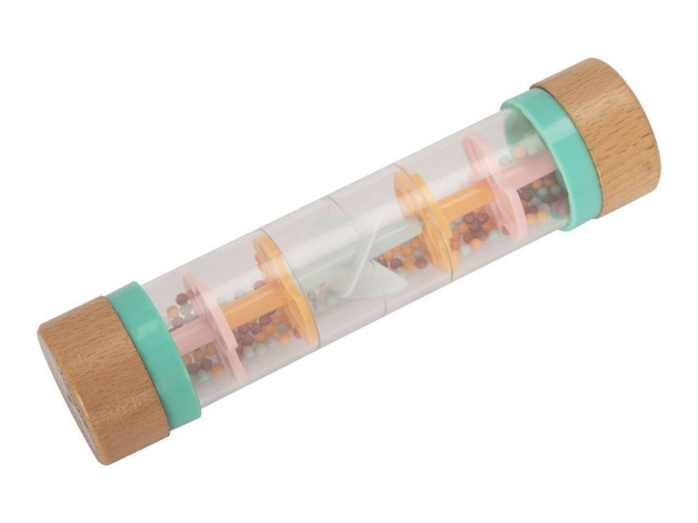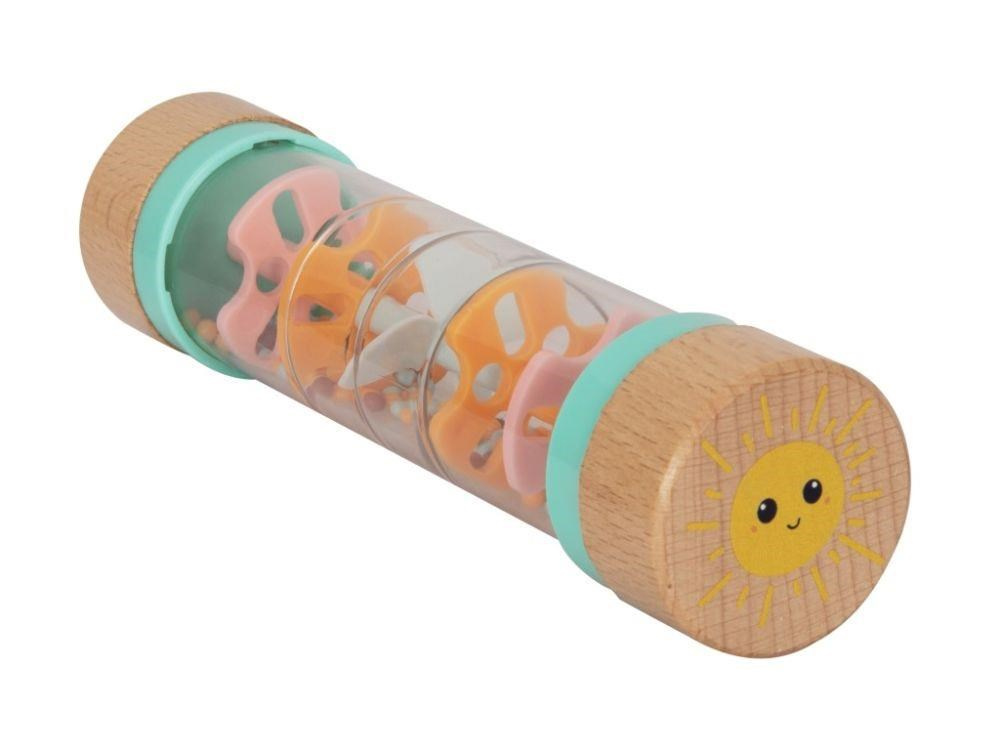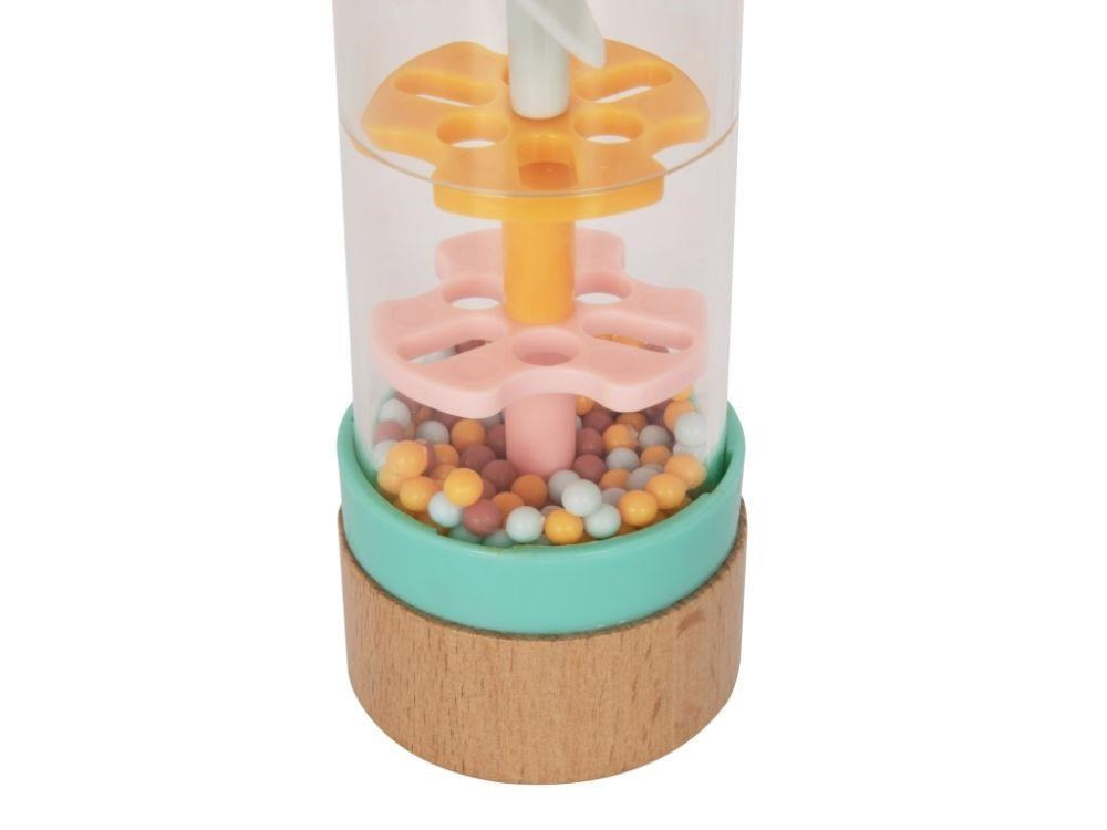 Chrastítko pro miminka v originálním designu, s průhlednou hlavní částí a barevnými korálky, láká miminka ke zkoumání a ke hře. Chrastítko Dešťové korálky se spoustou drobných korálků v jemných pastelových barvách vydává při každém pohybu příjemné zvuky. Při hře s chrastítkem miminka zdokonalují motorické dovednosti a stimulují smysly..