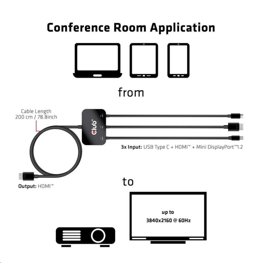 Club 3D CAC-1630 je dokonalým riešením pre každú konferenčnú miestnosť. Tento adaptér vám umožní pripojiť notebooky/tablety/telefóny, ktoré podporujú HDMI™, MiniDP™1.2 a/alebo videoportov USB typu C* k projektoru, televízoru alebo monitoru s rozlíšením HDMI™ 4K60Hz.