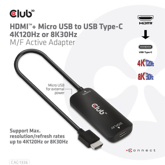 The Club 3D CAC-1336 is the perfect solution to connect to any USB Type-C 8K30Hz or 4K120Hz ready displays from a HDMI™ source which does supports these resolutions/specifications.