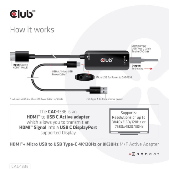 | In the box | - CAC-1336 HDMI™+ Micro USB to USB Type-C 4K120Hz or 8K30Hz M/F Active Adapter - USB Type-A to Micro USB M/M 1m / 3.28 ft cable for powering the adapter |