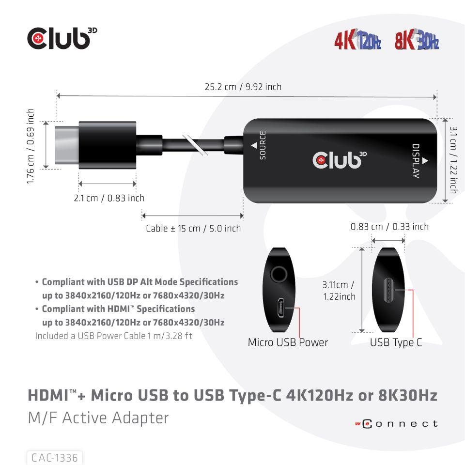 Club3D Adaptér HDMI + Micro USB na USB-C 4K120Hz/8K30Hz, Active Adapter M/F