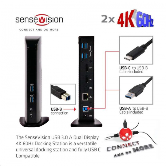 USB 3.0 Dokovacia stanica s dvoma displejmi 4K60Hz Je plne kompatibilný s rozhraním USB C a súčasťou balenia je kábel USB C. S týmto CSV-1460 môžete teraz pripojiť dve obrazovky s rozlíšením 3840x2160 UHD pri 60 Hz k takmer všetkým existujúcim notebookom alebo tabletom len pomocou jedného USB 3.1 port Gen 1! Vďaka pokročilému čipu DisplayLink™ DL-6950 môžete dokonca pripojiť jednu obrazovku s rozlíšením 5K pri 60 Hz! SenseVision USB 3.dokovacia stanica 1 Gen 1 s dvoma displejmi má praktický dizajn a odnímateľný stojan, ktorý umožňuje umiestnenie na stôl v horizontálnej alebo vertikálnej polohe. Je to nástroj na zvýšenie produktivity pre každého výkonného používateľa pracujúceho v (polo)profesionálnom prostredí. Duálny režim DisplayPort™ TECHNICKÉ ŠPECIFIKÁCIE .