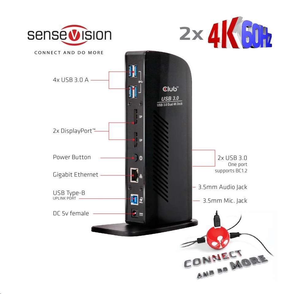 Club3D USB-A a USB-C Dual Display 4K60Hz Dokovacia stanica (6x USB 3.0/2x DP/Ethernet/USB-B/2x audio)