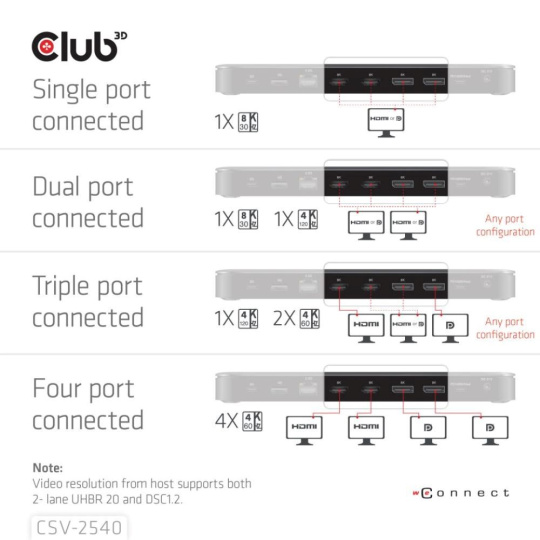 CSV-2540 je prenosná dockovacia stanica 14 v 1 USB Type-C® 10Gb/s na štyri displeje s režimom 2 pruhov DisplayPort™ 2.1 Alt , ktorá slúži na rozšírenie portu Type-C® o viac portov pre video, dáta, zvuk, Ethernet a napájanie a predstavuje ideálne riešenie na splnenie požiadaviek používateľov na rozšírenie. Má 4 videá (výstup štyroch 4K/60Hz videí súčasne, ak hostiteľ podporuje oba UHBR10&DSC) pre prenos videa, 5 portov USB pre prenos dát. 2,5 Gigabit Ethernet pre ultrarýchly Ethernet, microSD/SD kartu čítačku, 3,5mm kombinovaný audio konektor. Okrem toho je táto dockovacia stanica vybavená 150W jednosmerného napájania, ktoré ponúka max. 100 W pre pripojený počítač a tiež max. 30W nabíjania pre mobilné zariadenia USB-C.
