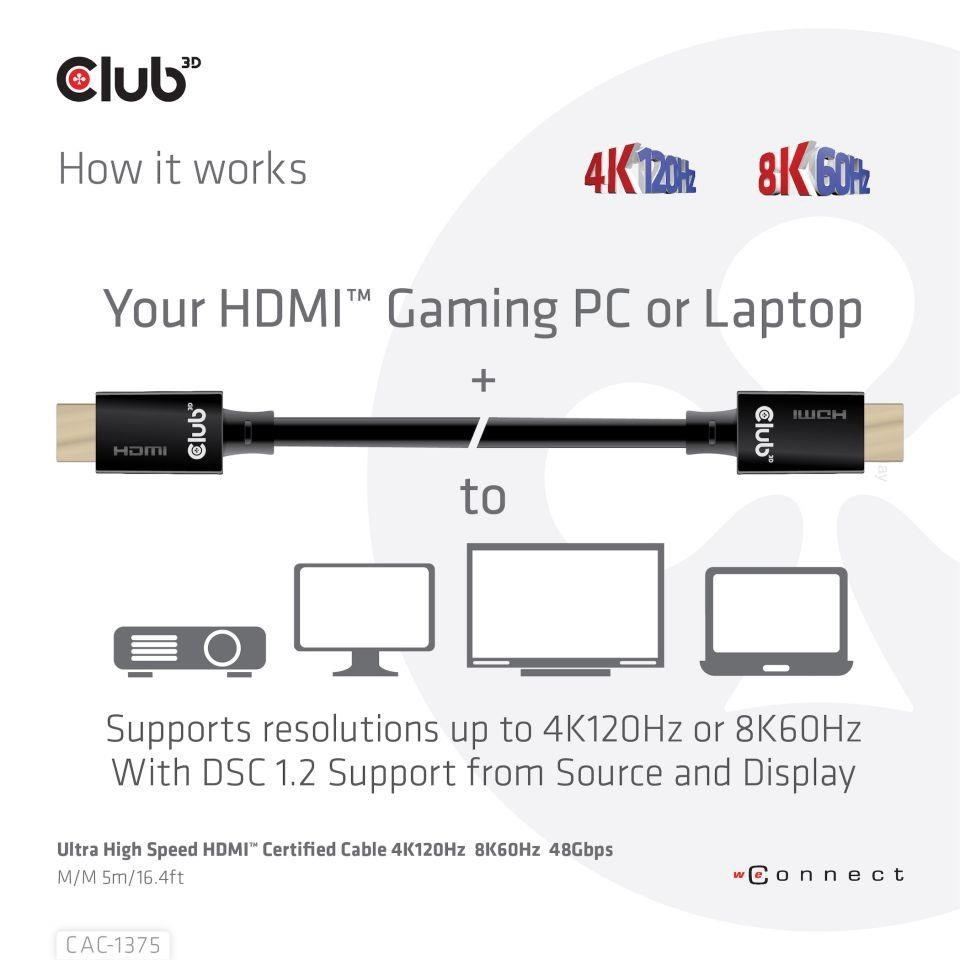 Club3D Ultra Rychlý HDMI™ Certifikovaný, 4K120Hz 8K60Hz 48Gbps M/M 5m/16.4ft, 28 AWG