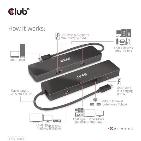 Club 3D CSV-1584 je USB 3.2 Gen2 Type-C, 6-in-1 Hub s HDMI™ 8K30Hz/4K60Hz, 2xUSB Type-A (10G), Ethernet RJ45 (1Gbps) a 2xUSB Type-C, 1x Video 4K60Hz alebo Dátové (10G) a 1xPD3.0 nabíjanie 100 wattov, čo poskytuje ideálne riešenie pre rozšírenie portu USB Type-C alebo hostiteľa Thunderbolt (PC/Laptop/mobilný telefón atď.), najmä pre tých, ktorí sú hostiteľmi s jedným USB Type-C portom. Tento rozbočovač využíva integrovaný obvod s podporou režimu DP1.4 Alt, ktorý umožňuje výstup maximálneho jedného 8K30Hz (DSC) alebo dvoch rôznych videí (2× 4K60Hz) a port USB Type-C Video tiež podporuje prenos dát USB3.2 Gen2 s maximálnou rýchlosťou 10 Gb/s. 2 video porty USB Type-A a USB Type-C umožňujú pripojiť 3 USB zariadenia súčasne. Port Gigabit Ethernet vám umožní surfovať na internete, port USB Type-C PD Charging podporuje max. 100W PD Charging. Môže fungovať na všetkých hostiteľoch USB Type-C s podporou režimu DP Alt.