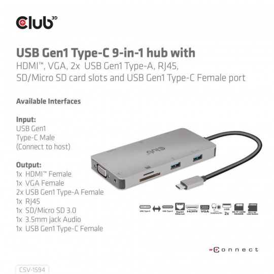 Rozbočovač Club 3D CSV-1594 USB Gen1 Type-C 9 v 1 s HDMI™, VGA, 2x USB Gen1 Type-A, RJ45, slotmi na karty SD/Micro SD a portom USB Gen1 Type-C Female predstavuje veľmi pokročilé a efektívne riešenie na rozšírenie jedného portu USB Gen1 Type-C na viac portov. Integruje video, dátové a napájacie porty, ktoré umožňujú pripojenie 2 displejov súčasne na sledovanie videí na väčšej obrazovke, pripojenie viacerých zariadení USB Gen1 na prenos dát rýchlosťou až 5 Gb/s, pripojenie zdroja Gigabit Ethernet na pripojenie počítača k superrýchlej sieti alebo pripojenie náhlavnej súpravy na počúvanie fantastickej hudby. Poskytuje tiež PD nabíjanie pre podporu až do max. 100W PD nabíjanie. Slúži na prevádzku tohto zariadenia a súčasné nabíjanie hostiteľa. Môže fungovať na všetkých DP™1.2 Podporované hostiteľské zariadenia USB Gen1 Type-C v režime Alt.