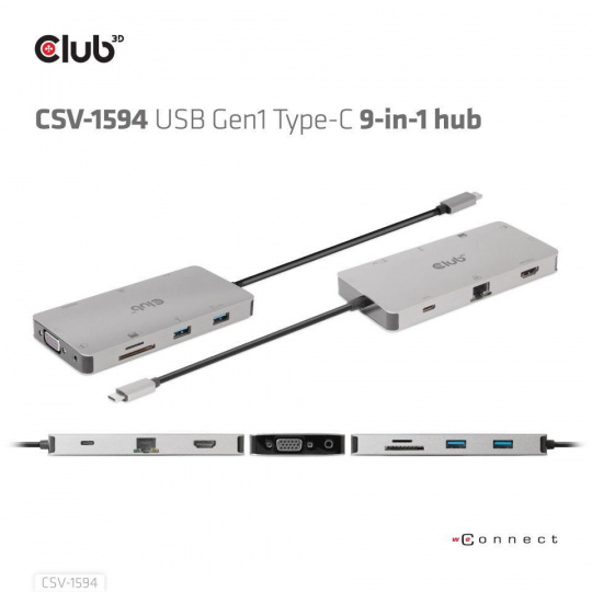 Club3D hub USB-C, rozbočovač 9 v 1 s HDMI, VGA, 2x USB Gen1 Type-A, RJ45