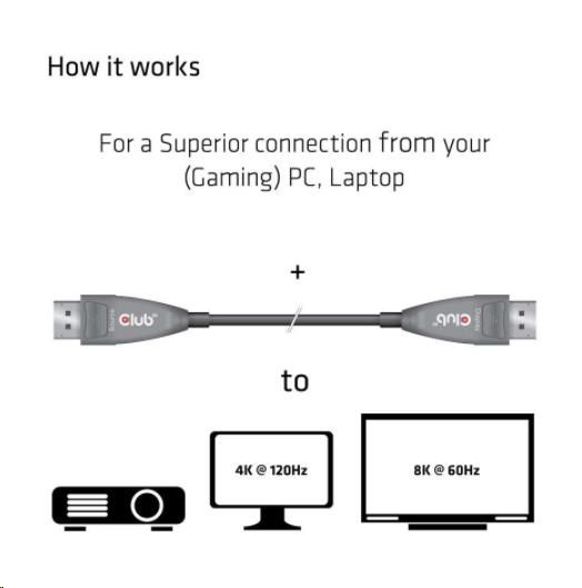 Club 3D CAC-1079 je aktívny optický jednosmerný kábel DisplayPort™, ktorý umožňuje podporu 8.1 Gb/s na kanál. Podporuje rozlíšenie 4K pri 120 Hz, ako aj 8K pri 60 Hz a formáty HDR. Tento kábel s optickými vláknami možno použiť na prenos audio a video signálov na vonkajších displejoch, LED tabuliach, displejoch domáceho kina, konferenčných miestnostiach, lekárskych zobrazovacích zariadeniach alebo bezpečnostných systémoch.