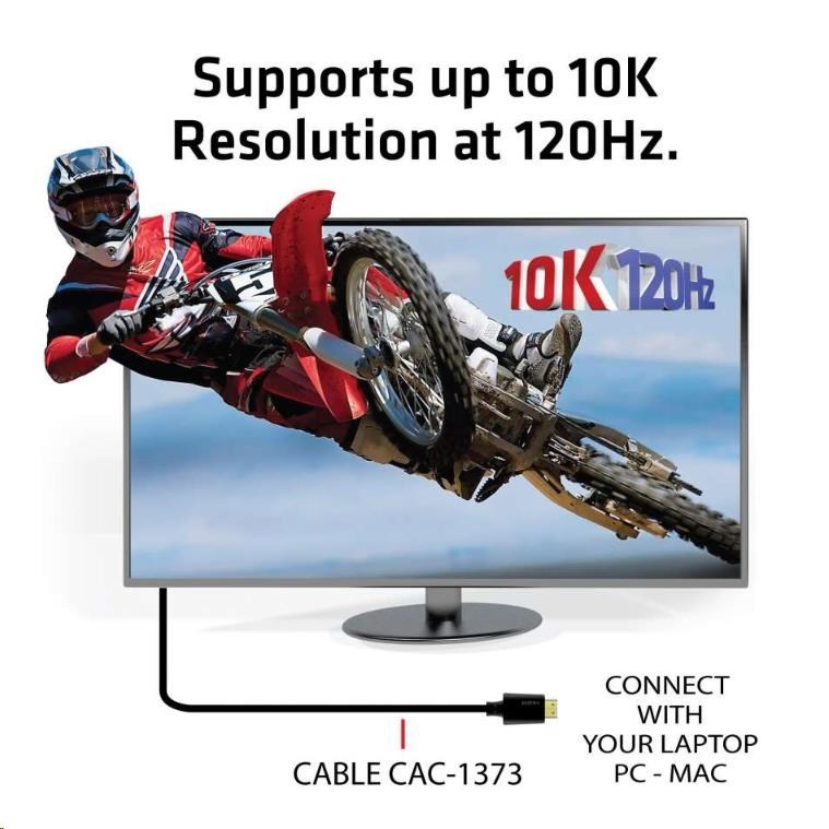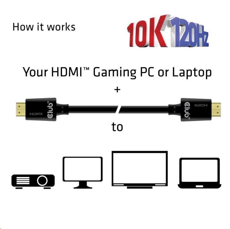 CAC-1373 - Ultra vysokorýchlostný HDMI™ kábel Club 3D je skonštruovaný tak, aby zvládol najvyššiu kvalitu video a audio signálov. HDMI™ má zvýšenú šírku pásma 48 Gb/s. Zvýšenie maximálnej šírky pásma v porovnaní s predchádzajúcimi verziami sa dosiahlo zvýšením prenosovej rýchlosti dátových kanálov (zo 6 Gb/s na 12 Gb/s) a počtu kanálov (z 3 na 4). To umožňuje podporu rozlíšení až do 10K pri 120 Hz!